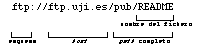 Cuando utilizamos ftp anónimo para copiar un fichero de un ordenador remoto a nuestro ordenador necesitamos saber lo siguiente: host o nombre del ordenador remoto donde se encuentra el fichero y path o via que conduce al fichero dentro de la estructura de ficheros del ordenador remoto. Supongamos que el fichero se llama README, y que está en el directorio pub del host ftp.uji.es; el URL de tal objeto sería éste:
